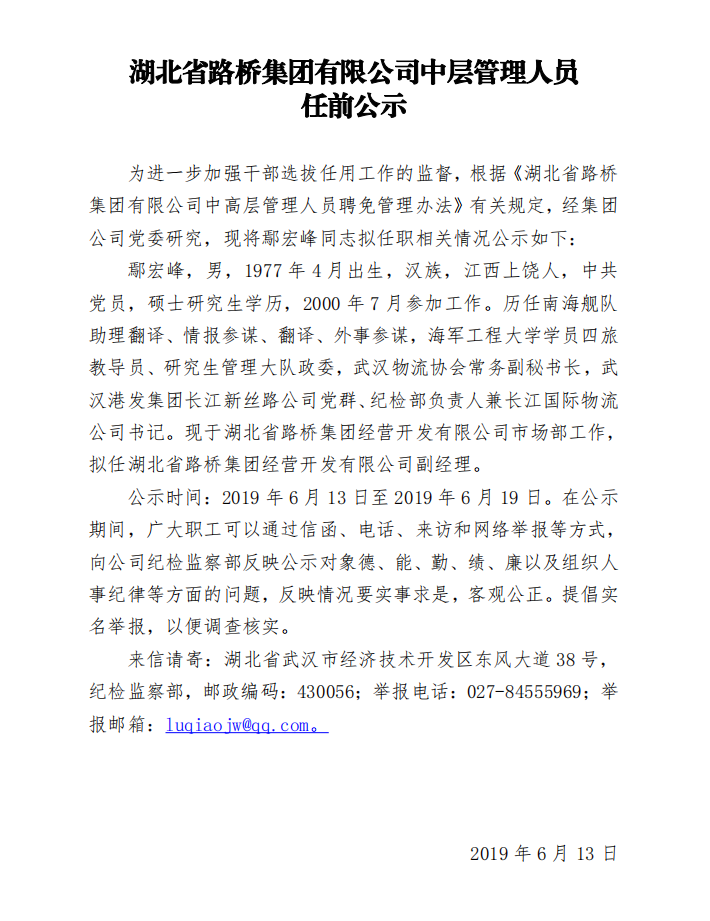 湖北省路橋集團(tuán)有限公司中層管理人員任前公示