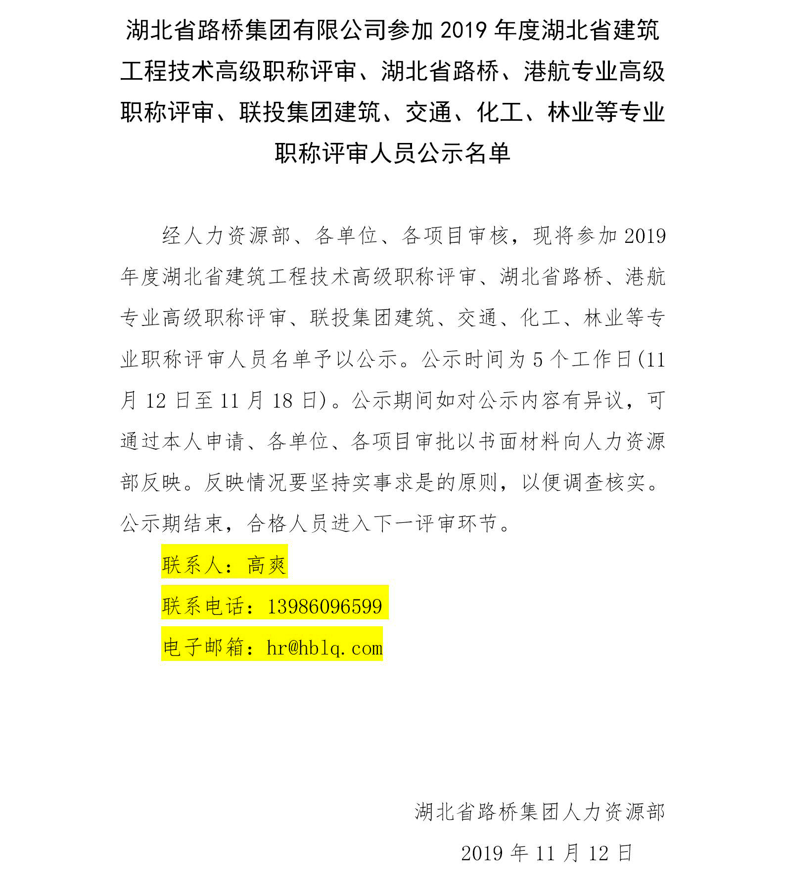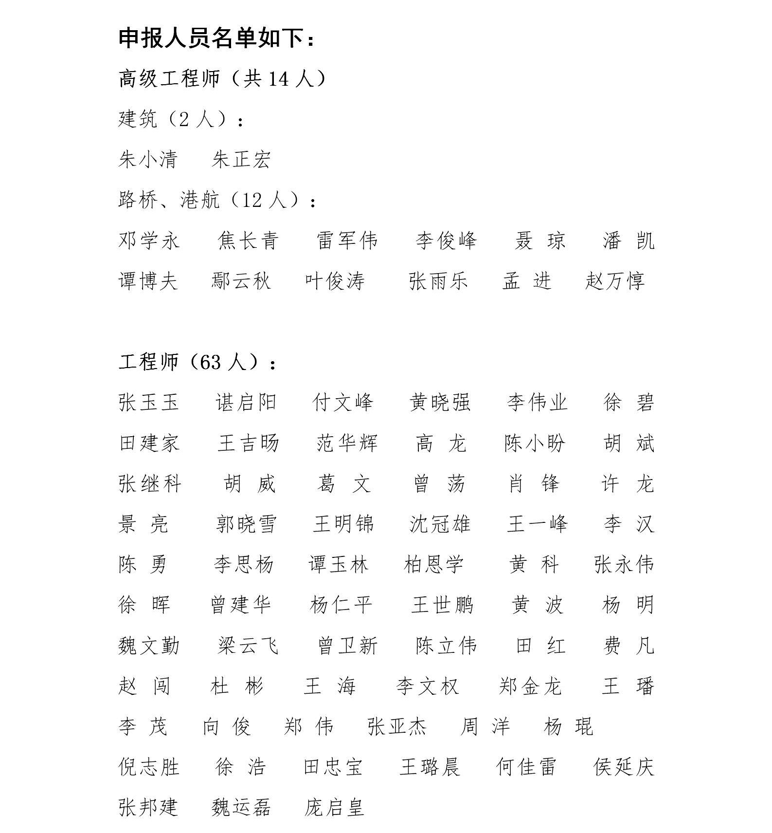 湖北省路橋集團(tuán)有限公司參加2019年度湖北省建筑工程技術(shù)高級職稱評審、湖北省路橋、港航專業(yè)高級職稱評審、聯(lián)投集團(tuán)建筑、交通、化工、林業(yè)等專業(yè)職稱評審人員公示名單