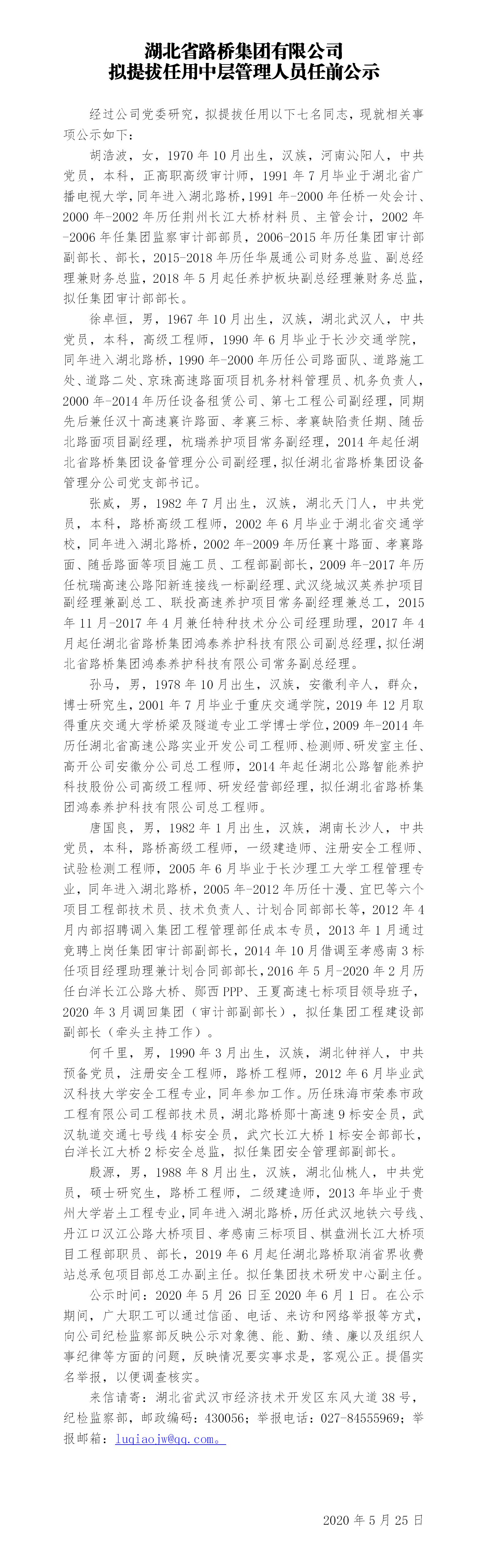 湖北省路橋集團(tuán)有限公司擬提拔任用中層管理人員任前公示