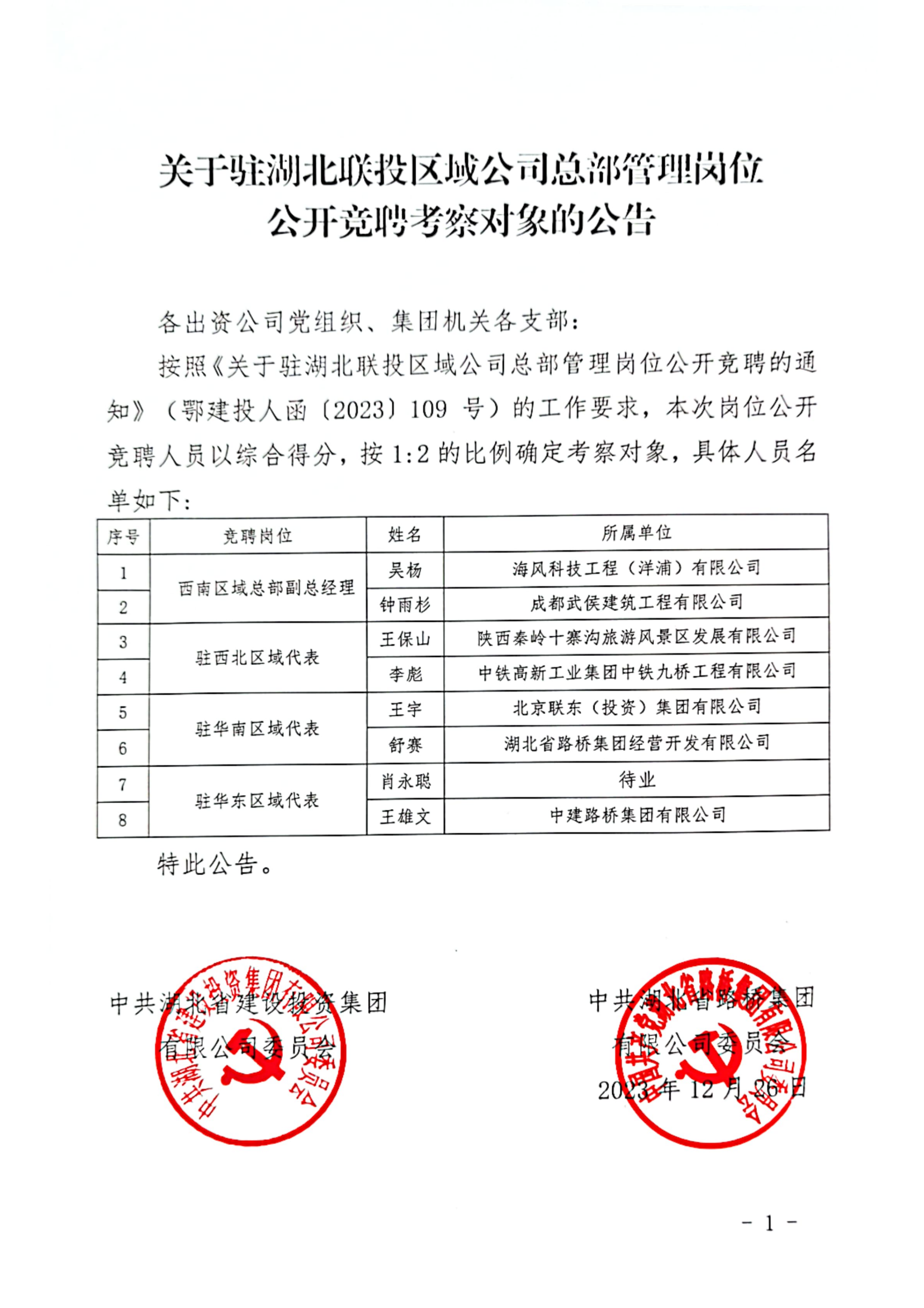 關(guān)于駐湖北聯(lián)投區(qū)域公司總部管理崗位公開競聘考察對象的公告