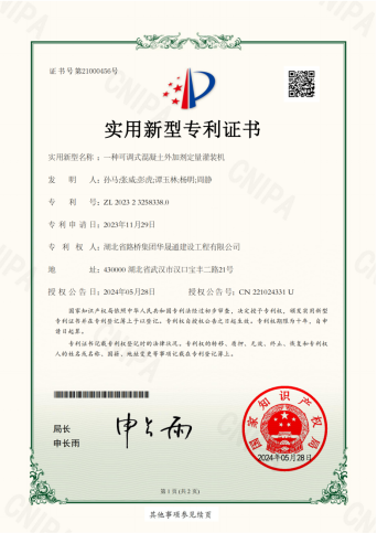5月28日,由湖北路橋華晟通公司自主研發(fā)的新型實用專利《一種可調(diào)式混凝土外加劑定量灌裝機》順利通過國家知識產(chǎn)權(quán)局嚴格審查,獲得專利證書。在特種混凝土領(lǐng)域,湖北路橋華晟通公司獲得多個專利、軟著、標(biāo)準(zhǔn)圖集、科技項目、實體工程及標(biāo)準(zhǔn)等相關(guān)知識產(chǎn)權(quán),牢固占據(jù)特種混凝土新賽道,進一步增強了公司科研創(chuàng)新驅(qū)動生產(chǎn)發(fā)展的強大動力。