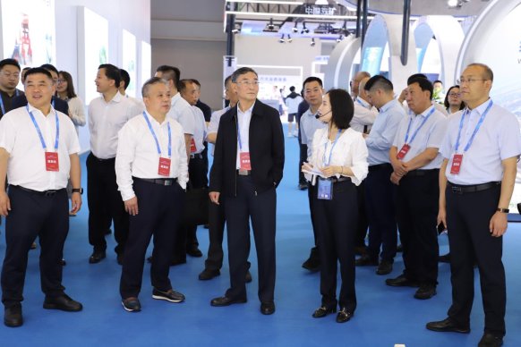 圖:中國(guó)交通運(yùn)輸協(xié)會(huì)副會(huì)長(zhǎng)兼秘書(shū)長(zhǎng)李剛(第一排左三)參觀湖北路橋展臺(tái)