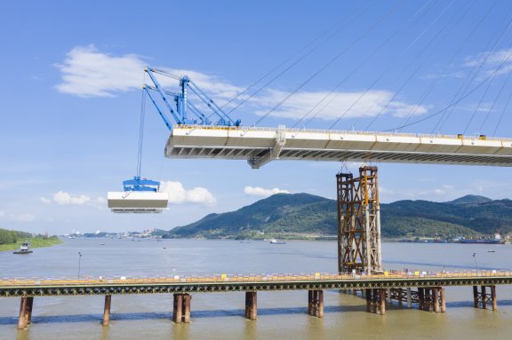 依托武穴長(zhǎng)江公路大橋項(xiàng)目,針對(duì)鋼箱梁架梁過(guò)墩的問(wèn)題,采用分節(jié)段承插式臨時(shí)墩施工技術(shù),提前施工第一節(jié)段的臨時(shí)墩,待臨時(shí)墩墩頂?shù)牧憾渭茉O(shè)完成后,再利用鋼箱梁梁面布置的液壓千斤頂和鋼絞線提升第二節(jié)段到設(shè)計(jì)標(biāo)高,為主梁架設(shè)過(guò)墩預(yù)留操作空間。結(jié)合施工工藝、監(jiān)控量測(cè)和成橋受力情況,在雙懸臂施工狀態(tài)下,創(chuàng)新性地在臨時(shí)墩與鋼箱梁之間采用軟連接設(shè)計(jì)。軟連接采用柔性吊帶穿過(guò)耳板連接,能夠快速地鎖定及解除,避免對(duì)結(jié)構(gòu)產(chǎn)生擾動(dòng),現(xiàn)場(chǎng)可操作性強(qiáng)。在主梁架設(shè)懸臂施工全周期方面具有良好的穩(wěn)定性、安全性和抗風(fēng)性,對(duì)于斜拉橋主梁懸臂施工條件下的臨時(shí)墩設(shè)置有一定的借鑒作用,具有較好的應(yīng)用效果及推廣應(yīng)用前景。