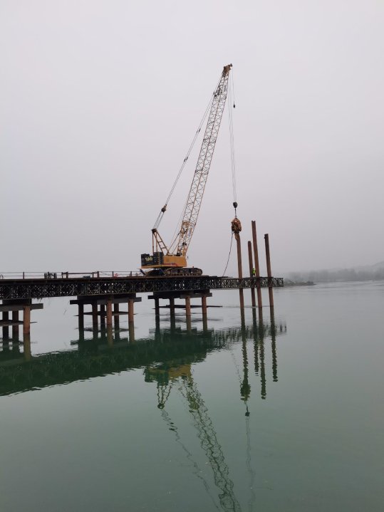 依托丹江口市水都二橋工程,通過(guò)“板凳+局部錨固”鋼管樁抗高流速水情施工技術(shù)、鋼管樁沉樁無(wú)引孔技術(shù)及鋼棧橋快速裝配施工技術(shù)等關(guān)鍵技術(shù),順利完成了鋼棧橋施工。通過(guò)鋼管樁直接振動(dòng)沉樁形成“板凳樁”,提高了棧橋橫向穩(wěn)定性,同時(shí)直接振打鋼管樁沉樁,管內(nèi)無(wú)需澆筑砼,提高了施工效率,降低了施工成本,此外,依次裝配安裝鋼棧橋各類裝配構(gòu)件以及裝配式定位導(dǎo)向架,減少了大量現(xiàn)場(chǎng)焊接工作,加快了施工速度,具有較好的推廣應(yīng)用前景。
