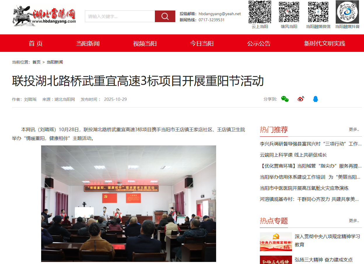 正值重陽節(jié),聯(lián)投湖北路橋武重宜高速3標(biāo)項目攜手當(dāng)陽市王店鎮(zhèn)王家店社區(qū)、王店鎮(zhèn)衛(wèi)生院舉辦“情暖重陽,健康相伴”主題活動,湖北當(dāng)陽網(wǎng)對活動進(jìn)行報道,以下是報道全文: